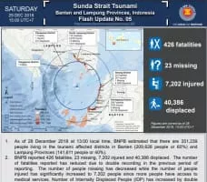 On 22 December 2018, a tsunami that followed an eruption and partial collapse of the Anak Krakatau volcano in the Sunda Strait struck several coastal regions of Banten in Java and Lampung in Sumatra, Indonesia. At least 426 people were killed and 14,059 were injured.