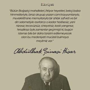 Abdülhak Şinasi Hisar was a Turkish writer. He spent his childhood in Rumeli Hisarı and studied at the Galatasaray High School and later political sciences in Paris. Back to Ottoman Empire, he worked for a French company and later for Stines Mining Company and Regie des Tabacs.