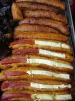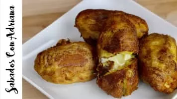 Aborrajado is a dish of deep fried plantains stuffed with cheese in Colombian cuisine. In general, an aborrajado means that the cheese-filled plantain is dipped in batter and deep-fried, although baked or grilled plantains stuffed with cheese and without the batter deep-fry are also common.