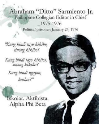 Abraham "Ditto" P. Sarmiento Jr. was a Filipino student journalist who gained prominence as an early and visible critic of the martial law regime of dictator Ferdinand Marcos.