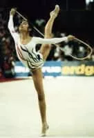 Adriana Dunavska is a Bulgarian individual rhythmic gymnast. She is the 1988 Olympic All-around silver medallist, 1987 World All-around silver medallist, 1989 World All-around bronze medallist and the 1988 European All-around champion. She also won a gold medal at the 1987 World Championships with the rope.