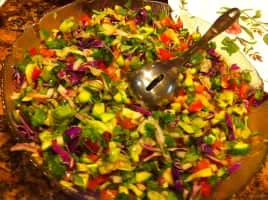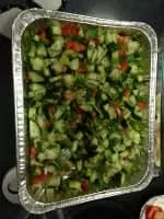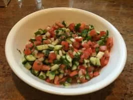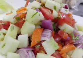 Afghan salad is a salad in Afghan cuisine that is prepared with the primary ingredients of diced tomato, cucumber, onion, carrot, cilantro, mint and lemon juice. Salt and pepper may be used to season the dish. Additional ingredients may be used, such as bell peppers, parsley, radish and herbs, among others.