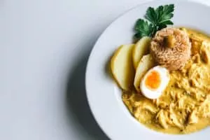 Ají de gallina is Peruvian chicken stew. The dish is considered a type of Peruvian comfort food, comprising chicken cooked with yellow chili peppers, walnuts, spices, garlic, and turmeric. The dish uses aji amarillo peppers, which are yellow, mildly spicy peppers.