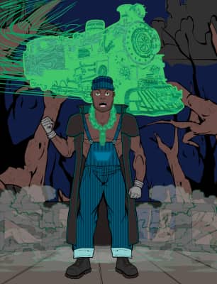 Alan Rails was a large muscular black man who wears an old-fashioned train conductor's cap with matching overalls, gloves, and a dirty, sleeveless greatcoat. The glowing green chain and train whistle around his neck allows him to summon ghost trains, which are capable of tunneling through solid rock.