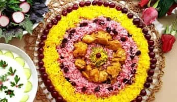 Albaloo polo is an Iranian side dish of rice and sour cherries usually served with chicken, koobideh, or other types of kebab as well as some form of stews. In Persian, albaloo is morello cherry; polo is pilaf, a style of cooked rice.