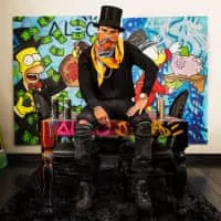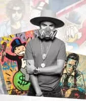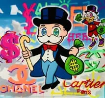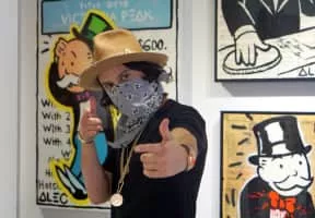Alec Andon, professionally known as Alec Monopoly, is a street artist originally from New York City. His signature is covering his face with his hand or using a medical face mask to hide his facial identity. His claim to fame is the use of the Parker Brothers legendary board game Monopoly character "Mr. Monopoly".