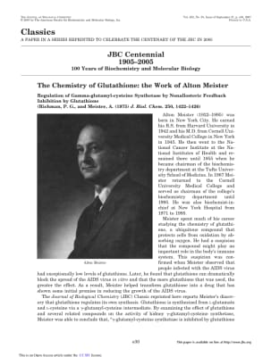 Alton Meister was an American biochemist who made pioneering contributions to the study of glutathione metabolism. Alton Meister was born in New York City to Morris Meister and Florence Glickstein Meister. He received an undergraduate degree from Harvard University and an MD from Cornell University Medical College.