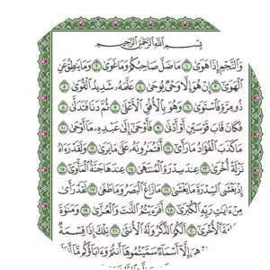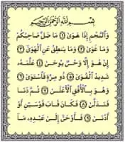 Sūrat an-Najm is the 53rd chapter of the Qur'an with 62 verses. The surah that opens with the oath of the Divine One swearing by every one of the stars, as they descend and disappear beneath the horizon, that Muhammad is indeed God's awaited Messenger. It takes its name from Ayat#1, which mentions “the stars”.