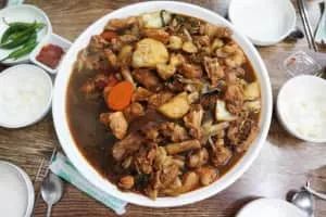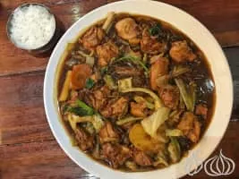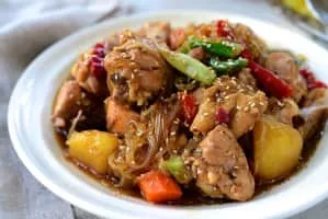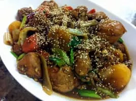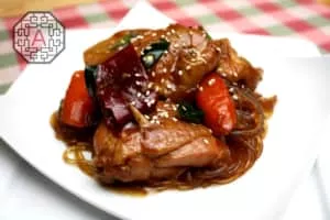 Andong-jjimdak is a variety of jjim, which originated in the city of Andong, Gyeongsangbuk-do Province and is made with chicken, various vegetables marinated in a ganjang based sauce. The name literally means "steamed chicken of Andong. "
