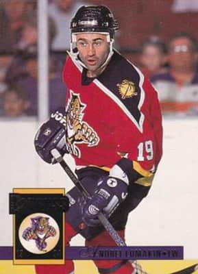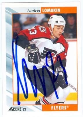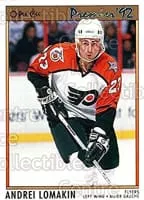 Andrei Vyacheslavovich Lomakin was a professional ice hockey player who played parts of four seasons in the NHL with the Philadelphia Flyers and Florida Panthers. He played in the Soviet Union prior to that, earning a gold medal at the 1988 Winter Olympics while a member of the Soviet national team.