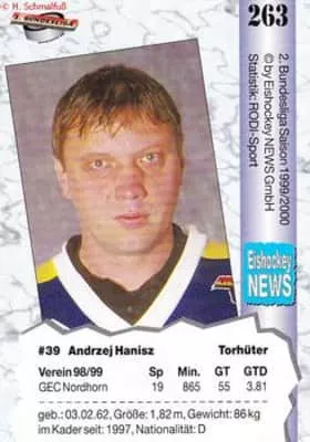 Andrzej Hanisz is a Polish former ice hockey goaltender. He is currently serving as a goaltender coach in Germany. Hanisz was a member of the Poland men's national ice hockey team which competed at the 1988 Winter Olympics held in Calgary, Alberta, Canada.