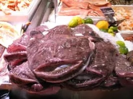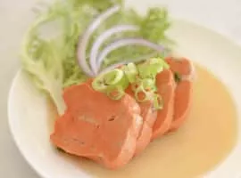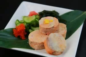 Ankimo is a Japanese dish made with monkfish liver. The liver is first rubbed with salt, then rinsed with sake. Then its veins are picked out and the liver is rolled into a cylinder and steamed. Ankimo is often served with momiji-oroshi, thinly sliced scallions and ponzu sauce.