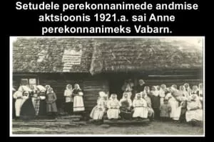 Anne Vabarna was a Seto singer. In her lifetime she recorded over 140,000 verses, most notably her composition of the Seto national epic 'Peko', depicting the tale of the Seto hero who provides freedom for the Seto people.