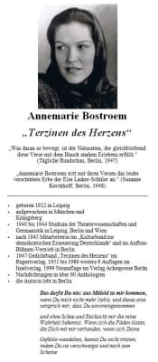 Annemarie Bostroem was a German poet, playwright, and lyricist. She lived most recently in the Prenzlauer Berg neighborhood of Berlin.