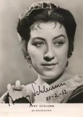 Anny Schlemm is a German operatic soprano and later mezzo-soprano. Her father, Friedrich Schlemm, was a chorister at the Oper Frankfurt. Schlemm studied in Berlin with Erna Westenberger and made her debut 1946 at the Halle Opera House in Halle an der Saale as Nanette in Lortzing's Der Wildschütz.