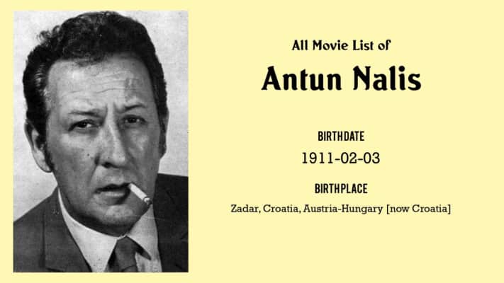 Antun Nalis, a.k.a. Tonči Nalis, was a Croatian actor. Antun Nalis was born in Zadar, which was part of Austria-Hungary at the time. After World War I Zadar became part of Italy, which later helped Nalis to play in Italian movies and portray Italian characters. Nalis began to build his film career after World War Two.