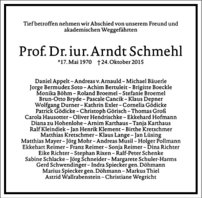 Arndt Schmehl (* 17. Mai 1970 in Herborn; † 24. Oktober 2015) war ein deutscher Rechtswissenschaftler und Professor an der Universität Hamburg. Seit 2012 war er ehrenamtlicher Richter am Hamburgischen Verfassungsgericht.* 17. Mai 1970 in Herborn; † 24. Oktober 2015