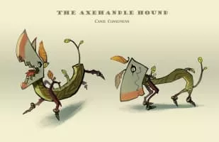 The axehandle hound, is an American fearsome critter of Minnesota and Wisconsin. Overall, it resembles a dog with a roughly axe-like shape. It has a head shaped like an axe blade hence the name, complemented by a handle-shaped body atop short stubby legs.