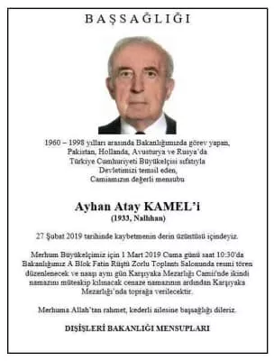 Ayhan Atay Kamel (28 Temmuz 1933, Nallıhan - 27 Şubat 2019, Ankara) Türk büyükelçi. Ankara Üniversitesi Siyasal Bilgiler Fakültesi'nden 1954 yılında mezun olmuş, aynı üniversitenin hukuk fakültesinde yüksek eğitimini görmüştür. Pakistan, Hollanda, Avusturya ve Rusya büyükelçisi olarak görev yapmıştır.28 Temmuz 1933, Nallıhan - 27 Şubat 2019, Ankara