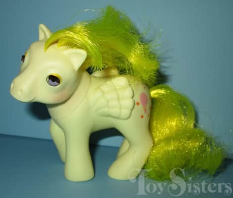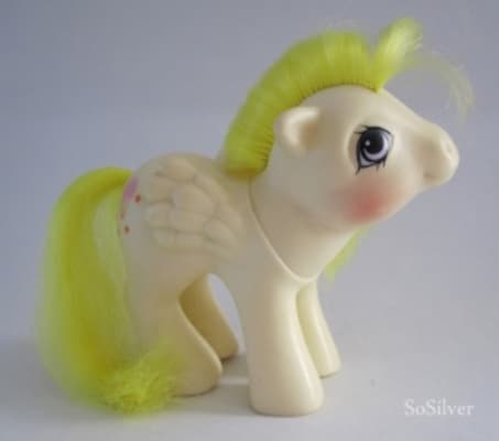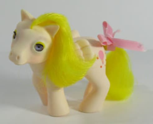 Baby Lofty is a Baby Pony Pegasus and the daughter of Lofty. She is light yellow with yellow hair and a pink bow on her tail. Her symbol is a pink hot air balloon surrounded with red stars. She looks almost exactly like her mom, Lofty, except for the pink bow on her tail.