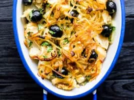 Bacalhau à Brás is made from shreds of salted cod, onions and thinly chopped fried potatoes, all bound with scrambled eggs. It is usually garnished with black olives and sprinkled with fresh parsley. The origin of the recipe is uncertain, but it is said to have originated in Bairro Alto, an old quarter of Lisbon.