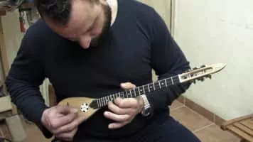 The baglamas or baglamadaki, a long necked bowl-lute, is a plucked string instrument used in Greek music; it is a smaller version of the bouzouki pitched an octave higher, with unison pairs on the four ...