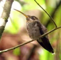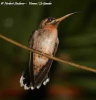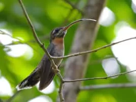 The band-tailed barbthroat is a medium-sized hummingbird which is a resident breeder from southeastern Guatemala and Belize to western Ecuador and western Venezuela. This hermit species inhabits the understory of wet forests, woodland edges and old second growth.