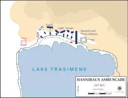 The Battle of Lake Trasimene was a major battle in the Second Punic War. The Carthaginians under Hannibal defeated the Romans under the consul Gaius Flaminius. Hannibal's victory over the Roman army at Lake Trasimene remains, in terms of the number of men involved, the largest ambush in military history.
