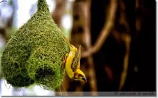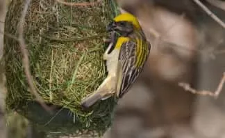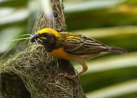 The baya weaver is a weaverbird found across the Indian Subcontinent and Southeast Asia. Flocks of these birds are found in grasslands, cultivated areas, scrub and secondary growth and they are best known for their hanging retort shaped nests woven from leaves.