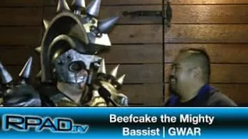 Beefcake the Mighty is the bassist of the heavy metal band Gwar. He appears as a stout humanoid girded in Roman-style armor. He is usually portrayed wielding either an oversized Gladius sword or a large battle-axe.