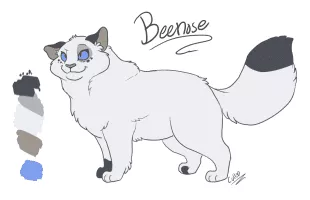 Beenose was the daughter of Snowbird and Scorchfur, born along with her littermates Yarrowkit and Bluebellkit. As an apprentice, Beepaw was mentored by Dawnpelt, but chose to defect to Darktail with the other apprentices when Rowanstar's leadership began to falter, and renamed herself Beenose.