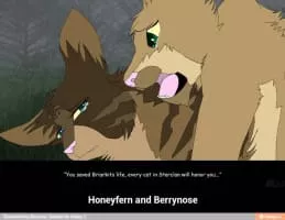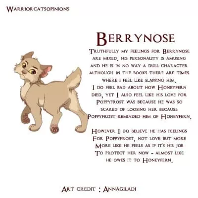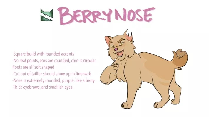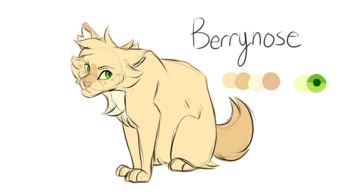 Berrynose is a cream-colored tom with a stump for a tail. Berrynose was a ThunderClan deputy under the impostor's leadership in the lake territories. He was born as Berry to Daisy and Smoky alongside his littermates, Hazel and Mouse.
