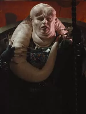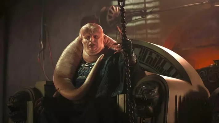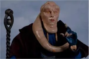 Those attempting to do business with Jabba the Hutt first needed to maneuver past his pasty-faced majordomo, the Twi'lek Bib Fortuna. The darkly robed attendant often hovered near Jabba's ear, offering advice and feeding information.