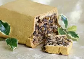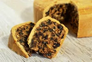 Black bun, sometimes known as Scotch bun, is a type of fruit cake completely covered with pastry. It is Scottish in origin, originally eaten on Twelfth Night but now enjoyed at Hogmanay. The cake mixture typically contains raisins, currants, almonds, citrus peel, allspice, ginger, cinnamon and black pepper.