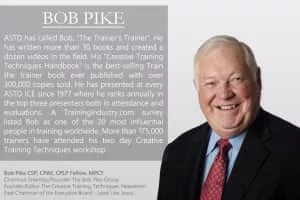 Bob Pike, full name Robert William Pike, is the founder, chairman and CEO of The Bob Pike Group in Minneapolis. He is known as “the trainer's trainer” and specializes in training those who train others.