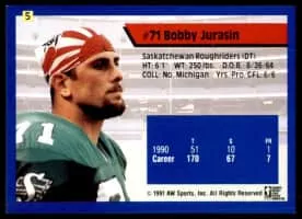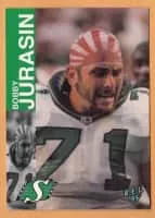 Robert Jurasin is a former defensive lineman for the Saskatchewan Roughriders from 1986–1997 and the Toronto Argonauts in 1998. He was a CFL All-Star in 1987, 1988, 1992 and 1997. He was a part of the Roughriders 1989 Grey Cup winning team. He also won the Molson Cup Most Popular Player in 1987 and 1997.