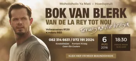 Bok van Blerk is a South African singer-songwriter who sings in Afrikaans. He became famous in 2006 for his rendition of "De la Rey" by Sean Else and Johan Vorster.