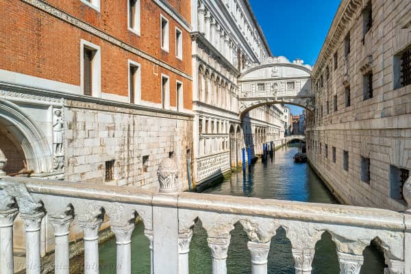 The Bridge of Sighs is a bridge in Venice, Italy. The enclosed bridge is made of white limestone, has windows with stone bars, passes over the Rio di Palazzo, and connects the New Prison to the interrogation rooms in the Doge's Palace.