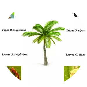 Brontispa longissima is a leaf beetle that feeds on young leaves and damages seedlings and mature coconut palms.