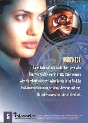Bryce Turing, potrayed by Noah Taylor, is a character from the Movies. He appears in both films. He is a friend of Lara's and a computer freak who designs and engineers Lara's equipment. He stays in a trailer outside Croft Manor and works in an office inside.