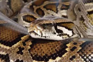 The Burmese python is one of the five largest species of snakes in the world. It is native to a large area of tropical South and Southeast Asia. Until 2009, it was considered a subspecies of Python molurus, but now is recognized as belonging to a distinct species.