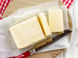Butter is a dairy product made from the fat and protein components of churned cream. It is a semi-solid emulsion at room temperature, consisting of approximately 80% butterfat.