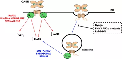 The calcium-sensing receptor is a Class C G-protein coupled receptor which senses extracellular levels of calcium ion. It is primarily expressed in the parathyroid gland and the renal tubules of the kidney.
