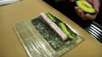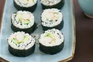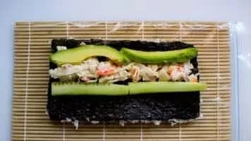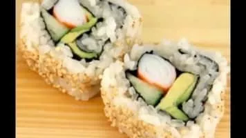A California roll or California maki is a makizushi sushi roll that is usually rolled inside-out, and containing cucumber, crab or imitation crab, and avocado.