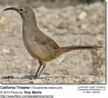 The California thrasher is a large thrasher found primarily in chaparral habitat in California and Baja California. Similar to the crissal and Le Conte's thrashers in habit, the California thrasher is the only species of Toxostoma throughout most of its limited range.
