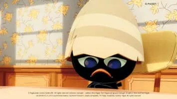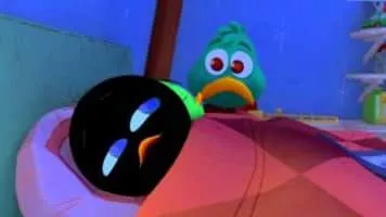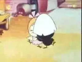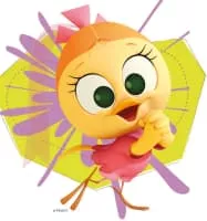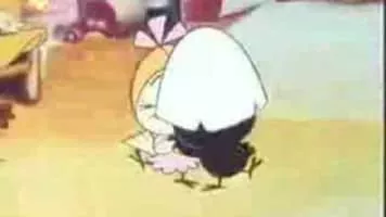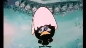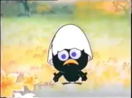 Calimero is an animated television series about a charming, but hapless anthropomorphized chicken; the only black one in a family of yellow chickens. He wears half of his egg shell still on his head.
