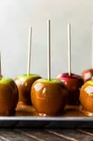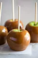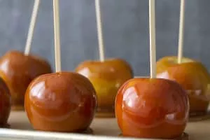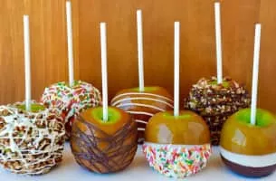 Caramel apples or taffy apples are created by dipping or rolling apples-on-a-stick in hot caramel, sometimes then rolling them in nuts or other small savories or confections, and allowing them to cool.
