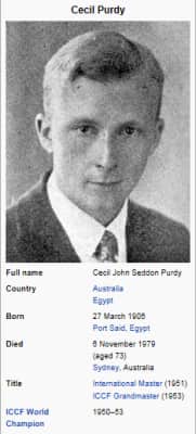 Cecil John Seddon Purdy AM was an Australian chess player and writer. He was awarded the titles International Master in 1951 and Grandmaster of correspondence chess in 1959. Purdy was the inaugural world correspondence chess champion. He was also an influential chess magazine writer, editor, and publisher.