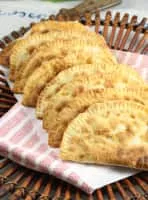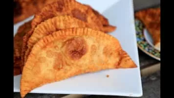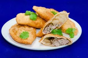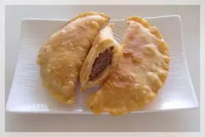 Chebureki is a deep-fried turnover with a filling of ground or minced meat and onions. It is made with a single round piece of dough folded over the filling in a crescent shape. Chebureki is a national dish of Crimean Tatar cuisine.