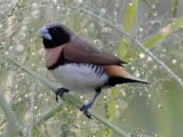 The chestnut-breasted mannikin, also known as the chestnut-breasted munia or bully bird, is a small brown-backed munia with a black face and greyish crown and nape. It has a broad ferruginous breast bar above a white belly. The species is found in Australia, New Caledonia, Indonesia, and Papua New Guinea.